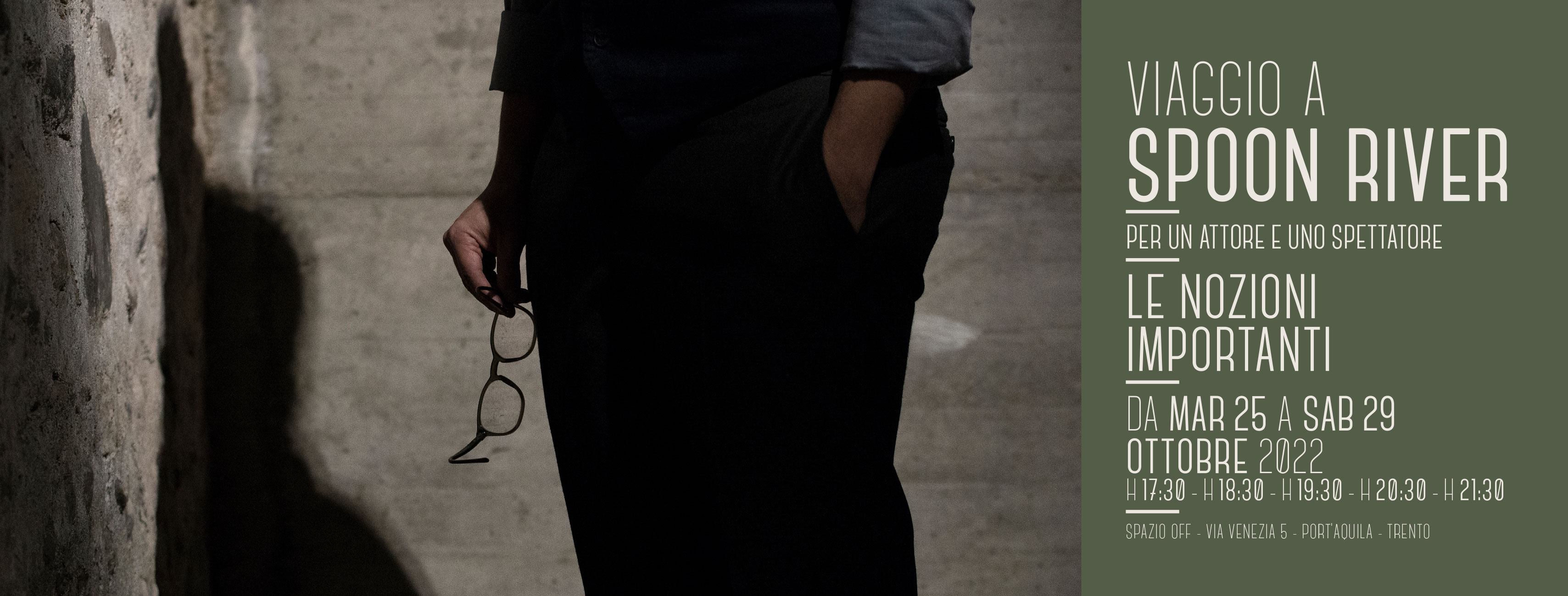 ‘Viaggio a Spoon River’ parte dai 244 epitaffi poetici dell’Antologia di Spoon River di Edgar Lee Masters. La vita dei personaggi dell’Antologia riprende voce nel corpo di un singolo attore, davanti a un solo spettatore o spettatrice alla volta.